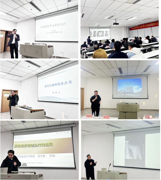 在学术分享环节,浙江大学附属第二医院李伟栩教授率先带来《IV型胫骨平台骨折的治疗》专题分享,结合丰富临床案例讲解了该病症的诊疗要点与技术难点。此后,来自临安区第一人民医院、第二人民医院、第三人民医院、第四人民医院、骨伤科医院等多家医疗机构的专家,依次围绕跟骨骨折微创治疗进展、肩关节损伤治疗体会、机器人辅助膝关节置换、椎间孔镜临床应用等十余项议题展开分享。嘉宾们结合自身临床实践,通过病例分析、技术反思、经验总结等形式,深入探讨了骨科诊疗中的前沿技术与实际难题,现场交流氛围热烈。
