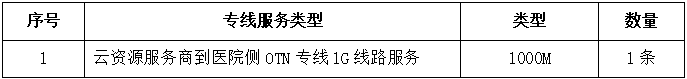 提供网络专线链路租赁服务1项,具体包含云资源服务商到医院侧OTN专线1G线路,服务期:1年(合同签订且验收合格之日起)。