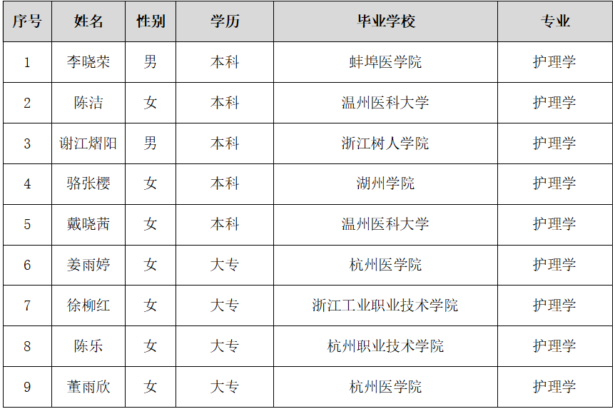 根据杭州市临安区第一人民医院2025年度第三批招聘考试结果,确定以下9位考生为我院拟录用人员。现进入体检环节,公示如下: