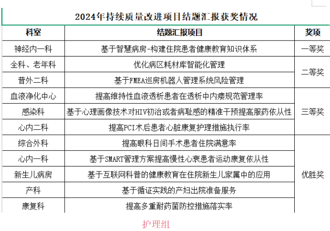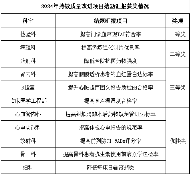 经过激烈的角逐,护理组、医疗组各评选出一等奖1项、二等奖2项、三等奖3项、优胜奖5项。获奖队伍不仅展示了品管活动的实际成效,也为全院树立了质量改进的标杆。