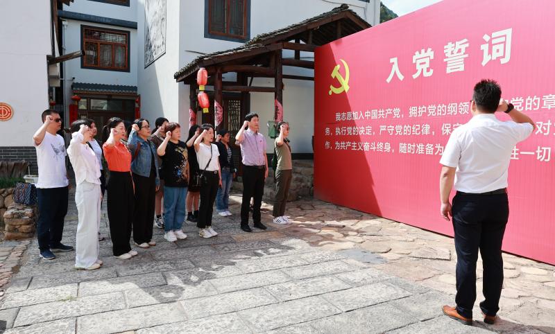在新四军纪念馆门口,党员们在支部书记的带领下,重温了入党誓词,“我志愿加入中国共产党,拥护党的纲领,遵守党的章程……”铿锵有力的誓词回响在纪念馆门口。