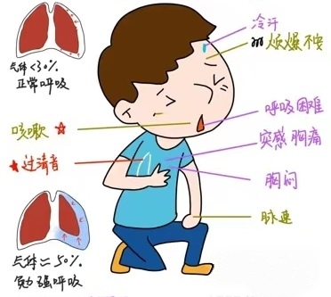 气胸发作时患者均有呼吸困难,其严重程度与发作的过程、肺被压缩的程度和原有的肺功能状态有关。在年轻的呼吸功能正常的患者,可无明显的呼吸困难,即使肺被压缩>80%,亦仅能在活动时稍感胸闷,而在患有慢性阻塞性肺气肿的老年患者,肺被轻度压缩就有明显的呼吸困难。急性发作的气胸,症状可能更明显;而慢性发作的气胸,健侧肺脏可以代偿性膨胀,临床症状可能会较轻。