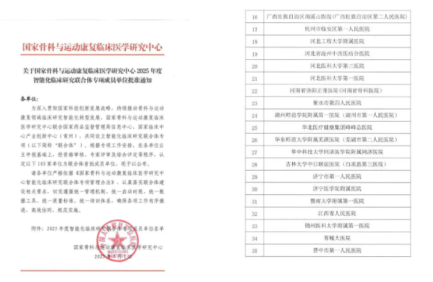 2025-07-03近日,在骨科与运动康复临床研究的赛道上,临安一院再传捷报!近日,我院凭借硬核实力成功入选“2025年度智能化临床研究联合体专项”首批成员单位 !